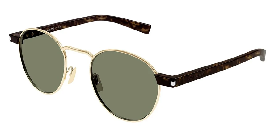 משקפי שמש איב סן לורן לנשים דגם SL707 002 49-21-145 בשילוב צבעי זהב, חום, מבריק, מנומר עם עדשות בצבע ירוק. סגנון הדגם אלגנטי, קלאסי. מסגרת מתכת. לדגם זה צבעים נוספים.