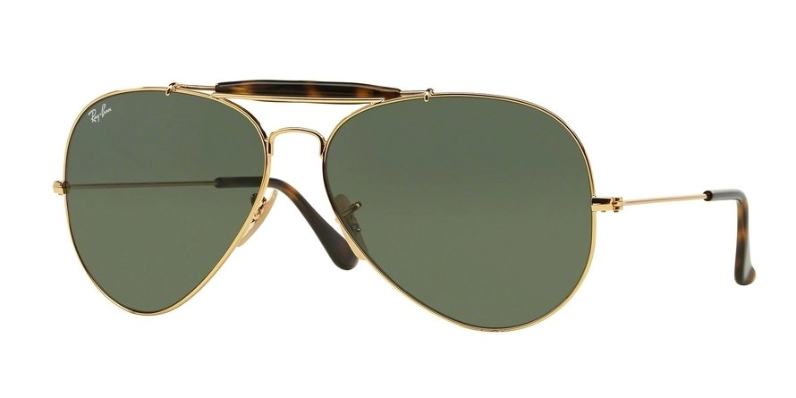 משקפי שמש רייבן יוניסקס OUTDOORSMAN II דגם RB 3029 181 62-14-140 בשילוב צבע זהב עם עדשות בצבע G-15 Green. סגנון הדגם טייסים, קלאסי. מסגרת מתכת.