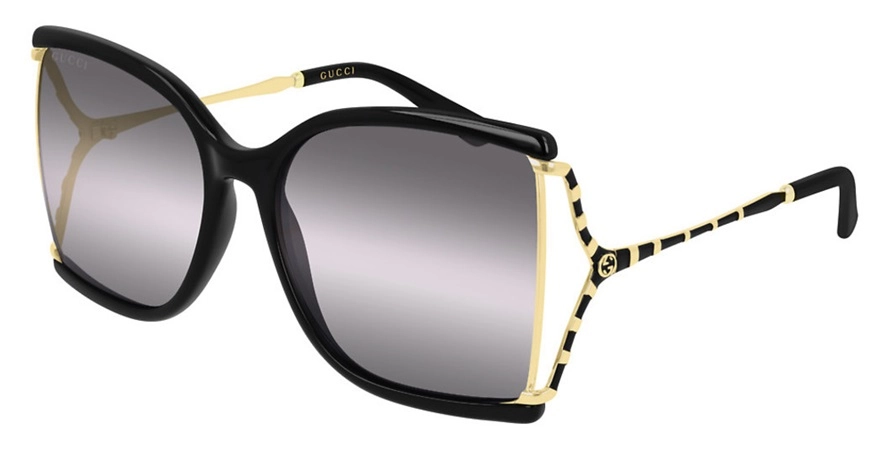 משקפי שמש גוצ'י יוניסקס דגם GG0592S 002 60-18-130 בשילוב צבעי זהב, מבריק, שחור עם עדשות בצבע אפור. סגנון הדגם אלגנטי, קלאסי. מסגרת מתכת, פלסטיק.