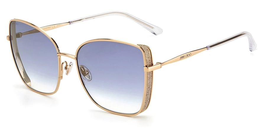 משקפי שמש ג'ימי צ'ו לנשים דגם ALEXIS/S 0001V 59-18-145 בשילוב צבע זהב עם עדשות בצבע כחול. סגנון הדגם אלגנטי, קלאסי. מסגרת פלסטיק. לדגם זה צבעים נוספים.