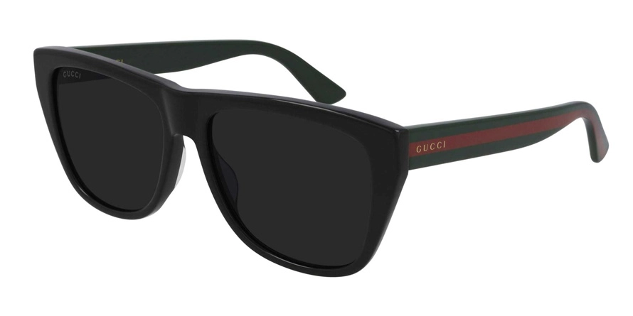 משקפי שמש גוצ'י יוניסקס דגם GG0926S 001 57-16-145 בשילוב צבעי ירוק, מבריק, שחור עם עדשות בצבע כחול. סגנון הדגם אלגנטי, קלאסי. מסגרת פלסטיק.