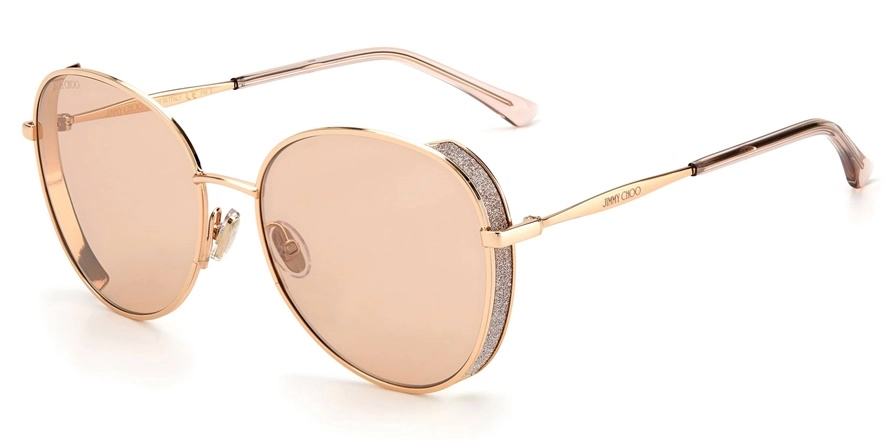 משקפי שמש ג'ימי צ'ו לנשים דגם FELINE/S DDB2S 58-17-145 בשילוב צבע זהב עם עדשות בצבע ורוד. סגנון הדגם אלגנטי, קלאסי פקאצות. מסגרת פלסטיק.