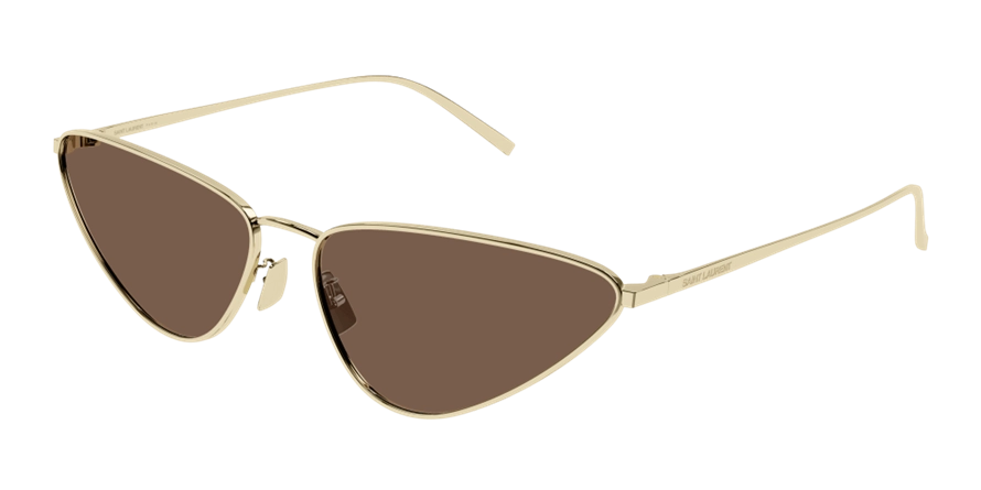 משקפי שמש איב סן לורן לנשים דגם SL487 003 63-15-140 בשילוב צבע זהב עם עדשות בצבע חום. סגנון הדגם אלגנטי, קלאסי. מסגרת מתכת. לדגם זה צבעים נוספים.