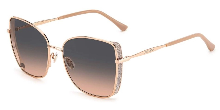 משקפי שמש ג'ימי צ'ו לנשים דגם ALEXIS/S PY3/FF 59-18-145 בשילוב צבע זהב עם עדשות בצבעי אפור, ורוד, חום. סגנון הדגם אלגנטי, קלאסי. מסגרת פלסטיק. לדגם זה צבעים נוספים.