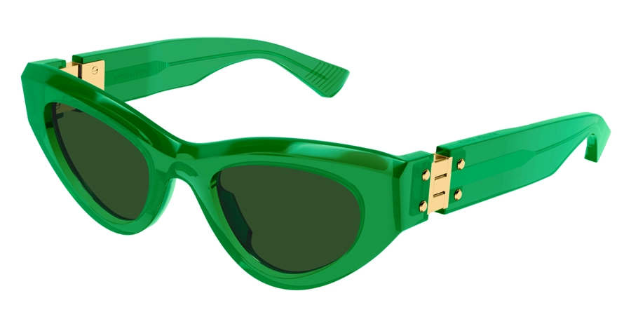 משקפי שמש בוטגה ונטה יוניסקס דגם BV1142S 004 49-22-140 בשילוב צבעי זהב, ירוק, מבריק, שקוף עם עדשות בצבע אפור. סגנון הדגם אלגנטי, יוקרתי, קלאסי, משקפיים עם קטע. מסגרת פלסטיק.