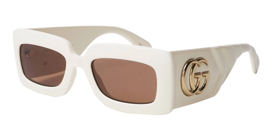 משקפי שמש גוצ'י לנשים דגם GG0811S 002 53-21-145 בשילוב צבעי לבן, מבריק עם עדשות בצבע חום. סגנון הדגם אלגנטי, קלאסי. מסגרת פלסטיק. לדגם זה צבעים נוספים.